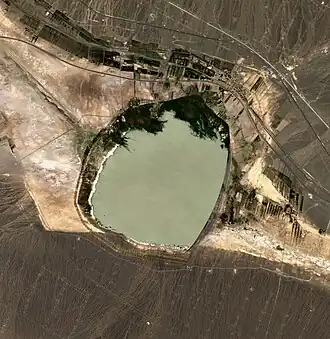 The lake is almost round, some 5–6 km in diameter, which makes it the largest freshwater lake in the Ürümqi region.[1] Chaiwopu Township, Chaiwopu Railway Station on the Lanxin Railway, and China National Highway 312 are located near the northern and northeastern shore of the lake.