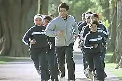 ![]() Screenshot from the music video of "Chak De! India" picturized Kabir Khan(SRK) running and practicing with the Indian women's hockey team. | |