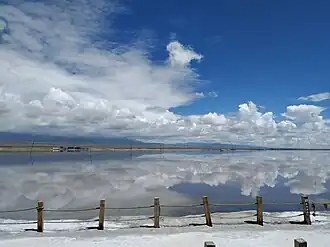 Chaka Salt Lake (Chinese: 茶卡盐湖; pinyin: Chákǎ Yánhú; Standard Tibetan: ཚྭ་ཁ་མཚོ་) is a salt lake in Ulan County, Haixi Prefecture, Qinghai, China.[1][2] The oval-shaped lake is located near the eastern end of Qaidam Basin, 298 kilometres (185 mi) to the west of the provincial capital Xining.[3] The name "Chaka" (ཚྭ་ཁ) means "salt lake" in Tibetan.[4]