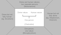 The Chalcedonian Definition was largely based on the 433 Formula of Reunion, with some additions from Cyril's other letters.[32] It attempted to define the via media between the opposite heresies of Eutyches and Nestorius. For example, it used the phrase "unconfusedly, unchangeably, indivisibly, inseparably" (Greek: ἀσυγχύτως, ἀτρέπτως, ἀδιαιρέτως, ἀχωρίστως); the first two words were directed at Eutyches, and the second two at Nestorius.[33]