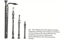 About ten original chalumeaux are extant, but modern craftsmen produce replicas based on these original instruments. Of the original instruments, most are made of boxwood and all feature two keys placed opposite each other to be played by the thumb and first finger of the left hand. The mouthpieces of these instruments usually have the reed placed on top so that it vibrates against the upper lip when played.[4] The surviving chalumeaux were made between the beginning of the eighteenth century and about 1760 by five known instrument makers including J.C. Denner, W. Kress, Liebau, Klenig, and Muller.[4] Of these instruments, there is one soprano and one bass chalumeau, several tenor and alto chalumeaux, and one rare chalumeau d’amour (aka Mezzo-Soprano chalumeau). The chalumeau d’amour has a bulbous bell like its rare contemporary the clarinette d’amour (aka "Mezzo-Soprano Clarinet") and the modern-day English horn or "Alto Oboe".[3]