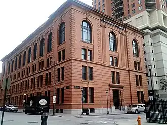 The Chamber of Commerce Building is a historic office building located in Baltimore, Maryland, United States. It is a Renaissance Revival–style of architecture with a brown glazed brick building five floors in height, eleven bays long on the west/east sides, facing Commerce Street on the west and Custom House Avenue to the east. Three bays wide (north/south) on the Water Street side, and rebuilt 1904–1905, using still standing walls/facades. It was built during the rebuilding of the old financial district in Downtown Baltimore following the Great Baltimore Fire of Sunday/Monday, February 7–8, 1904 (third worst conflagration to ever hit an American city), and features many terra cotta decorative elements. The rebuilt structure was designed by Baltimore architect Charles E. Cassell.[2] The original pre-fire building was designed by locally famous and prominent architect John Rudolph Niernsee in 1880 and was used by the old Corn and Flour Exchange, which maintained a trading floor on the fifth level.[3]