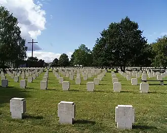Champigny-Saint-André is a German World War II cemetery in Normandy, France. It is located 5 kilometers South of the village of Saint-André-de-l'Eure, about 25 km (16 mi) south east of Évreux. The burials are from the summer of 1944, as the Allies pushed out of Normandy towards Paris. It is the second largest of the six German war cemeteries in Normandy with nearly 20,000 burials. The cemetery is maintained and managed by the voluntary German War Graves Commission (Volksbund Deutsche Kriegsgräberfürsorge).