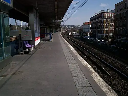 Champigny station is a railway station in the commune of Saint-Maur-des-Fossés, near the town Champigny-sur-Marne, Val-de-Marne, France. Champigny is on the A2 branch of the RER A with eastbound trains to Boissy-Saint-Léger and westbound trains to Saint-Germain-en-Laye.[2] It is situated on the Grande Ceinture line.