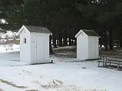 The only other buildings on the site are two outhouses, located to the rear of the school building. Both are non-functional, display models. One outhouse is an original 1870s structure, transported to the site and reassembled.[6] The other outhouse is a copy, built from salvaged materials during the school restoration. Neither outhouse is historically associated with Chana School and both are considered non-contributing factors in the schoolhouse's National Register of Historic Places listing.[6]
