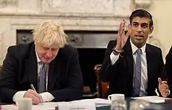 On 17 March 2020, Sunak introduced a programme providing £330 billion in emergency support for businesses,[27] as well as a furlough scheme for employees. This was the first time a British government had created such an employee retention scheme.[28][29] The scheme was introduced on 20 March 2020 as providing grants to employers to pay 80% of a staff wage and employment costs each month, up to a total of £2,500 per person per month.[29] The cost has been estimated at £14 billion a month to run.[30] The Coronavirus Job Retention Scheme initially ran for three months and was backdated to 1 March. Following a three-week extension of the countrywide lockdown the scheme was extended by Sunak until the end of June 2020.[31][32] At the end of May, Sunak extended the scheme until the end of October 2020. The decision to extend the job retention scheme was made to avoid or defer mass redundancies, company bankruptcies and potential unemployment levels not seen since the 1930s.[33] After a second lockdown in England on 31 October 2020, the programme was further extended until 2 December 2020,[34] this was followed on 5 November 2020 by a lengthy extension until 31 March 2021.[35] On 17 December 2020, the programme was further extended until 30 April 2021.[36] In the 2021 budget held on 3 March 2021, Sunak confirmed that the scheme had been extended once more until 30 September 2021.[37]