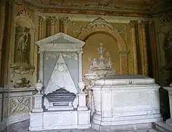 Like the church itself, the interior of the mausoleum is decorated with wall-paintings which feature trompe-l'œil effects. The ceiling is painted with a miniature copy of the dome of the Pantheon, Rome. The style is Rococo and generally playful, although skulls are depicted. The artist for the mausoleum was Gaetano Brunetti.[3] Some sources say Francesco Sleter was also involved.[4]