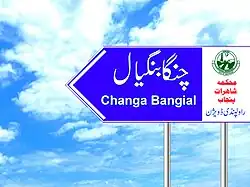 Changa Bangial (چنگا بنگیال) [3] is a Union Council and an administrative subdivision of Gujar Khan Tehsil District Rawalpindi in the Pothohar Plateau region of Punjab Province of Pakistan.[4][5] It comprises 56 small and large settlements (Dhoks), each with distinctive names, such as Dhok Achha Khan, Dhok Hayat Bakhsh, Jhandaran, Chhappar Shareef, Choora Sahreef, Noor Wasla, Mohra Darryaal, Daryala Saigan, Mohra Aheer, Mohra Kamaghar, Mohra Jaaghh, Shaheed Nagar, Bharol, Dhanda, Narali Jubair, Mall Awan, Mauza Hararr, Habib Chowk, Dhok Naseemiyan, Noor Ali Chowk, Sabbar, Dhok Baagh, Changa Maira, Bhaagsana and many more.[6]