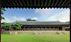 A single-story hall where the king received council and conducted politics.[92] It is a designated Treasure.[82] Spirit tablets were also possibly stored here.[92] It was built in 1405 and originally named Jogyecheong (조계청; 朝啓廳; Chogyech'ŏng). It received its current name in 1461. After being destroyed in 1592 during the Imjin War, it was rebuilt in 1608. It was destroyed in 1623 during the Injo coup and rebuilt in 1647, using materials recycled from a building called Gwangjeongjeon in In'gyŏnggung. It has since become the oldest extant building in the palace.[93] It is the only remaining Joseon palace building with blue roof tiles, which were then considered luxurious and difficult to make.[94][95] During the colonial period, the building was opened to the public, and glass put in its windows. The building was restored to its pre-colonial appearance in 1996.[95] |