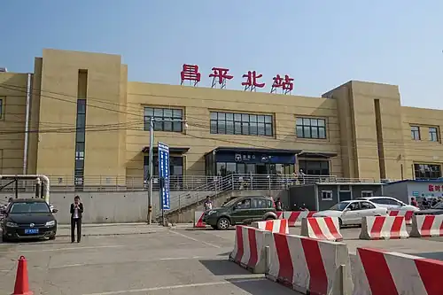 Changping North railway station (Chinese: 昌平北站; pinyin: chāngpíng běi zhàn), also known as Changpingbei railway station, is a railway station in Gulou North Street in the urban area of Changping District, Beijing. The old station started construction in 1976 and opened on 1 May 1980, with the whole Beijing–Tongliao railway. All services were stopped between June and October in 2016 to build a new station. On 1 November 2016, the new station opened, with its waiting hall expanded to 2,987 square metres (32,150 sq ft).[1] This station became the new terminal of all long-distance trains whose terminal used to be Beijing North railway station. On 31 December 2017, the suburban railway Huairou-Miyun line opened, and this station started to offer services for suburban railway passengers.[2]