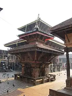 - In September 2001, three idols were stolen from the temple, including that of Bhupalendra Malla. King Bhupalendra Malla had build two statues of himself and his wife Bhuvan Laxmi. The idols were erected 297 years ago in the main gate of the temple. The metal statue with the gold plate was 19 inches high and weighed 50 kg.[9]