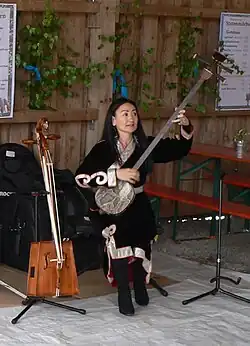 A chanzy (also spelled chanzi or tyanzi) (Tuvan: чанзы) is a three-stringed lute instrument from the Tuvan Republic.[1] It looks like a long-necked banjo with a skin head (goat or snake skin) glued over a heart or kidney-shaped wooden hoop body.[2] The neck is (660 mm) long and made of pine wood. Some models have frets, others not or only drawn on. Usually it has two similar sound-holes and some painted decoration. It is most commonly used to accompany throat singing. Like on the doshpuluur the three (nylon) strings are tuned by modern guitar tuners, the extra long tuning pegs, on some instruments, are just for decoration. Often the peg-head has a carving of a horse head (very common on instruments around Mongolia). It produces a louder tone than the doshpuluur, and is commonly used throughout Central Asia.[3]