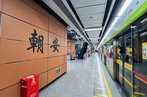 Chao'an Station (Chinese: 朝安站; pinyin: Cháo'ān Zhàn; Jyutping: ciu4ngon1 zaam6) is a metro station on the Guangzhou Metro's Guangfo Line (FMetro Line 1).[1][2] It is located underground at the junction of Zhaoxiang Road (兆祥路) and North Chao'an Road (朝安北路) in the Chancheng District of Foshan.