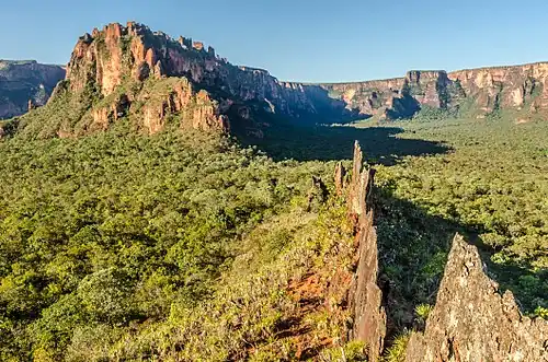 The park is in the Pantanal Biosphere Reserve, which also includes the Pantanal, Emas and Serra da Bodoquena national parks, and the Serra de Santa Bárbara and Nascentes do Rio Taquari, Pantanal de Rio Negro state parks.[3] The park is in the basin of the upper Paraguay River, protecting the headwaters of the Cuiabá River, one of the main feeders of the Mato Grosso Pantanal.[4] Chapada is a Brazilian word that means a region of steep cliffs, usually at the edge of a plateau.