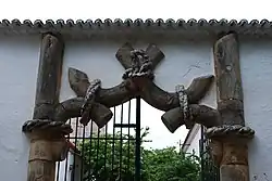 In the first years of the 17th century, the palace received a decorative palette, considered "one of the richest group of fresco mural paintings encountered in Portuguese art".[2][8] The rooms in the Palace extend along the horizontal plane, with a single corridor linking the spaces, including the Sala das Tapeçarias (Tapestry Hall), with sillar covered in 17th-century polychromatic blue-and-white azulejo tile, white marble fireplace, tile floor, and vaulted ceiling with phytomorphic painting.[1] Several of the main rooms include spaces with painted fresco ceilings, and 17th-century blue-and-white/yellow azulejo tile, such as the Sala do Gigante (Hall of the Giant), with 16th-century fresco depicting the biblical episode between David and Goliath, which is framed by the arms of the Dukes of Braganza; the Oratório da Duquesa (Duchess' Oratory); andSala de Medusa (Hall of Medusa), with a painted fresco representing the battle between Medusa and Perseus. These group of paintings were"largely faithful to the aesthetic canons of the Italianate Mannerists".[2] The compositions are replent in Moorish-influenced motifs executed between 1600 and 1640 by different painters: Tomás Luís, famous Lisbon painter, was attributed to the "two notable mural [ceiling] decorations" in the Hall of Medusa and the gallery of Duchess Catherine and José de Avelar Rebelo painted the ceilings of the Music Pavilion.[2][9] The remainder of these rooms extend laterally through the accessway: the Sala de D. Duarte (Edwards' Hall), with a painted ceiling, with anthropomorphic elements and tiled floor; the Sala dos Duques (Hall of the Dukes) or Sala dos Tudescos is a noble salon and largest room in the building, decorated with frames of 17 Dukes of Braganza, from Joseph I: the Sala das Virtues (Hall of Virtues) has a ceiling of notable craftsmanship comprising framed paintings showing the seven theological virtues and morals, among them: Fé (Faith), Esperança (Hope), Caridade (Charity),Prudência (Prudence), Justiça (Justice), Forteleza (Strength), Temperança (Temperance) and Sapiência (Wisdom); and theSala de Jantar (Dining Hall) there is a similarly paneled ceiling with medallions, decorated in classical and mythological motifs. The rooms five doorways give access to the Jardim das Damas (Lady's Garden).