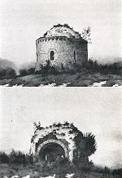 The chapel consists of a circular rotunda, preceded to the west by a nave that disappeared at some undetermined time. All that remains is the start of the gutter walls in contact with the rotunda. The large arcade linking the nave to the rotunda was closed off in the 19th century, and the resulting diaphragm wall was pierced by a semicircular door. The rotunda is lit by seven non-equidistant round-headed windows, averaging 1.50 × 0.40 m in size.[40] The bay that can be considered axial, opposite the door, is slightly wider, perhaps to accommodate a stone altar[41] underneath, which was replaced by a wooden one in 1697.[42] A niche, perhaps a washbasin, is cut into the wall beneath one of the windows.[43] The base of these windows is approximately 2 m above ground level.[44] A molding runs halfway up the wall of the rotunda, highlighting the arches of the bays; the wall below this molding marks a slight rise.[45] All that is left are the remains of the porch or room, perhaps a sacristy,[46][30] which preceded the doorway to the south of the rotunda.[47] Although the function of the massive masonry wall framing this door is not yet clear, some historians refute the hypothesis that it could have been part of a sacristy to which it would have given too low a ceiling height.[41]