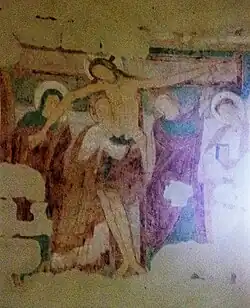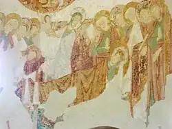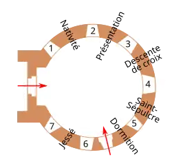 Six large biblical scenes are interspersed between the bays. Clockwise, from the entrance to the rotunda, we find the Nativity, the Presentation of Jesus in the Temple (this iconographic theme was little used in the Romanesque period, with only three representations in France, including the one at Le Liget),[68] the Descent from the Cross, the Holy Sepulchre and the Dormition of Mary.[69] The Tree of Jesse is the sixth painting. The Descent from the Cross and the Holy Sepulchre interrupt the cycle of scenes dedicated to Mary, although she is present as a secondary figure in the Descent from the Cross.[70] Traces of paint on the intrados of the arch marking the start of the nave suggest that other scenes took place here, perhaps the Annunciation and the Visitation, which would be chronologically the first in the cycle, but this hypothesis cannot be verified.[71][72]