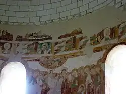 On the intrados of the dome was a figuration of the Apocalypse, mentioned in 1625 by a Carthusian monk, in continuity with the theme of the third register.[83] This fresco was probably already too badly damaged by the poor condition of its support to be saved during the 19th century consolidations.[84] Only the names of two cities in Asia Minor, Laodicea and Philadelphia - out of the seven mentioned in the first chapters of this book - remain discernible.[85] According to Angelico Surchamp, the theme of the Agnus Dei could have appeared at the top of the dome.[65]