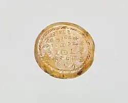 The signs appear mostly on apotropaic spells and phylacteries, but also on a few ancient curse tablets.[1] They may appear as loose groups of characters on a magical gemstone or spell to large groups alongside other figures on a magical text or table.[3] They are often used alongside comprehensible arcane words, like the voces magicae in the texts of the Greek Magical Papyri.[4] Charaktêres were not intended as an alternative-alphabet or code - they were usually used only once or twice in the context of a single spell.[5]