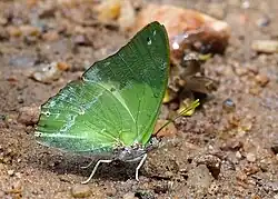 The green colouration is produced by pigments as opposed to being produced structurally, which is common in most green butterflies.