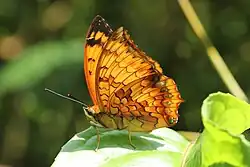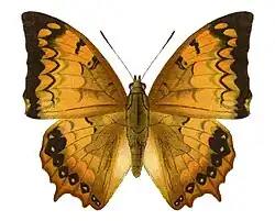On the underside the ground colour is paler yellow than in marmax, the transverse black lines crossing both wings more sinuous and more heavily marked, the space between the sinuous transverse lines immediately below apex of cell of forewing, and the space between the continuations of the same lines on the hindwing, rich dark ochraceous chestnut. On both forewing and hindwing the space beyond the lunular, postdiscal, transverse line heavily marked with ochraceous chestnut, especially on the hindwing; the subterminal line of silvery spots on the forewing forms a continuous band; the terminal narrow reddish-brown band on the hindwing very strongly marked. In the female the differences on the underside from marmax are similar in character and as conspicuous and marked as in the male.[1]