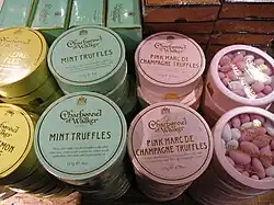 Charbonnel et Walker offers a wide variety of chocolates, as well as sugar confections like crystalized ginger and glazed brazil nuts. A speciality is the Marc de Champagne Chocolate Truffles: these are chocolate truffles with chocolate butter infused with Marc de Champagne.