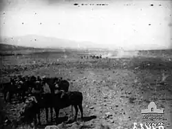 The 4th and 12th Light Horse Regiments (4th Light Horse Brigade) were deployed on the right, while the 14th Light Horse Regiment and the Régiment Mixte de Marche de Cavalerie (RMMC) (5th Light Horse Brigade) took up a position on the left with the 3rd Light Horse Brigade in the rear; "each in column of squadrons in lines of troop columns."[19] The uncontested advance of the Régiment Mixte de Marche de Cavalerie quickly got behind the enemy's right flank; riding "up the valley, swinging westward near 'Artuz to get beyond reach of fire from the high ground at Kaukab."[23]