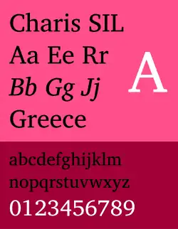 Charis (/ˈkɛərɪs/) or Charis SIL is a slab serif typeface developed by SIL International based on Bitstream Charter, one of the first fonts designed for laser printers. The font offers four family members: roman, bold, italic, and bold italic.
