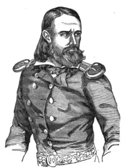 After the Mexican War, May was posted to several parts of the American frontier, including California,[17] New Mexico,[18] and Texas.[19] He served with the First Regiment of Dragoons in the Kansas Territory during its violent abolitionist clashes. On March 3, 1855, he was promoted to major and exchanged positions with another officer to return to his old unit, the Second Dragoons. On October 27, 1855, the regiment marched to Texas, under the command of Albert Sidney Johnson.[4][20]