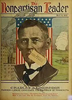 In 1918, Lindbergh ran for governor of Minnesota as a Republican against the Republican incumbent, Joseph A. A. Burnquist. Lindbergh was endorsed by the Farmers Nonpartisan League, which called for government ownership of some agricultural enterprises, such as mills, plants, and grain elevators. Many of his campaign speeches were attended by thousands of supporters. But due to his opposition to American entry into the first World War and his connection to the Socialistic Farmers Nonpartisan League, Lindbergh was attacked by the press and there were often protestors who pelted him with eggs and rocks. Lindbergh's son Charles worked as his driver and "never forgot the hostile crowds that harassed his father, or the way the press derided him." Lindbergh's 1918 bid for governor ultimately failed.[8] In 1924, Lindbergh was once again a candidate for governor on the Minnesota Farmer–Labor Party ticket. Lindbergh's campaign was cut short by his death. He would have been the first Minnesota governor from the party if he had been elected.