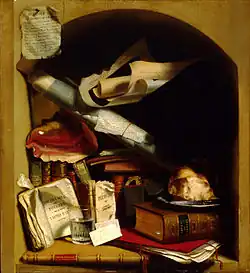 King took more than stylistic cues from these examples, as he also employed some of the techniques which he saw. As Nicholas Clark wrote in 1982, King "sometimes relied upon Dutch prints for formal solutions."[7] The prints were sources of valued composition. Many of King's paintings include features that show the influence of Dutch art. As noted above, King incorporated the techniques of Dutch painting into his portraits, though he recognized that the United States was not yet as familiar with "references to the style as it would be in the sphere of "post-Civil War materialism…[3]". King was especially influenced by the Dutch tradition of trompe l'oeil, a technique that resulted in illusions capable of deceiving the viewer.[8] King especially used this technique in his still-life paintings.