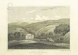 His father having died in March 1807, Calmady matriculated at Oriel College, Oxford in July of that year, aged 16.[7][8] Lysons (1822) gave his residence as Holne Chace, on Dartmoor.[3] His mother died aged 73 in 1828 at Langdon Hall, Devon, the family seat in the parish of Wembury, about 5 miles (8.0 km) from Plymouth.[9][10] She had bought West Wembury farm, from the Lockyer family, and owned also the barton at Down Thomas, where the manor belonged to Edmund Pollexfen Bastard.[11]