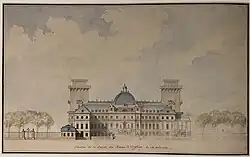 In 1767, de Wailly was accepted as a member of the first class of the Académie royale d'architecture and, in 1771, was accepted in the Académie royale de Peinture et de Sculpture, the only professional architect of the time to win admission, a mark of his great facility as a draughtsman.[4] Henceforth de Wailly regularly exhibited at the Paris Salons his renderings, designs and models. He gained wider publicity when two of his designs were engraved for the Encyclopédie and two more for the monumental Description de la france of the 1780s.