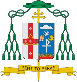 Clouds are found in chief, with three lines radiating above them, to recall the voice of God the Father whose favour rested on his Son and his Son's mission; this being expressed in the motto: Sent to serve (cf. Mark 10: 45). To the left of the Christogram is a jug of water pouring into a basin, to symbolise cleansing in a typical Jamaican way, and to the right is a pair of cupped hands, being “at once clasped in prayer and open for service”. The Trinity is completed with the dove hovering over the Christogram, the Holy Spirit which must inspire wisdom and love in those whom Christ calls to serve as Priests, like the armiger. Finally, flames make for canting arms as the surname “Dufour” means of the furnace in the language of the armiger's father, French. But the flames are also indicative of the fervour and zeal with which he ministers.[15] |