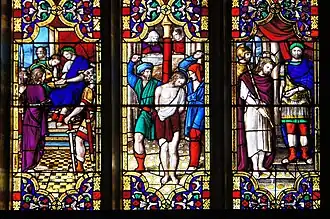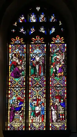 Stained glass by Clutterbuck, showing the trial an Crucifixion of Jesus, St Mary's Church, Bury St Edmunds
