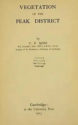 Charles Edward Moss (February 7, 1870 Hyde, Cheshire – November 11, 1930 Johannesburg), was an English-born South African botanist, the youngest son of a nonconformist minister, and is noted for being the editor of the first two parts of The Cambridge British Flora published in 1914 and 1920. The Cambridge British Flora, under the editorship of Moss, was intended to be a ten-volume survey of the flora of Britain, with contributions by specialists in particular genera. The two volumes that saw publication were of a very high standard, but the project was subsequently abandoned.[1][2]