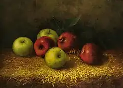 In 1878, Porter moved to Hartford, Connecticut and established a studio. The city was experiencing tremendous growth, and its wealthy citizens were interested in art and culture and had the money to begin or add to art collections. Porter's traditional academic art education made him a standout compared to the many self-taught artists who had recently moved to Hartford. He was one of the few artists at the time, and the only man, to specialize in still life painting.[1][5] While in Hartford, Porter created many of the still life paintings that he is known for today. A number of his paintings of fruit were not typical of the period, as they did not include tableware, porcelain, and glassware and unusual touches such as insects. His apple paintings were a commercial success and he painted apples for much of his career.[1]