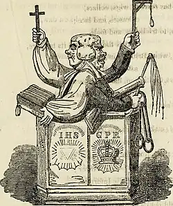 Caricature of a two-faced clerical magistrate, from 1819, with the right-hand part holding gallows, scourge, blunderbuss and shackles.[39]