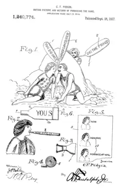 In 1916, Pidgin filed a patent application to display dialogue in silent films, proposing that actors inflate balloons or party favor-like objects with text on them to recreate the act of speaking.[21] The idea never took off, and this proposal has only received modern attention as being a rather ludicrous idea.[22][23][24]