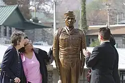 A bronze statue of him was unveiled at the Charles George VA Medical Center (CGVAMC) in Asheville on Sept. 24, 2016. “What a privilege is it to honor a true American hero in such a memorable way,” said Cynthia Breyfogle, CGVAMC director, said at the event. “I was both thrilled and humbled when I first heard that we would receive this statue. The legacy of Charles George was, and still is, an inspiration and influence beyond his local community. His courage and example join those of other brave men and women, past and present, who have answered the call when their country needed them.” The statue was sculpted by James Spratt, a U.S. Navy veteran, who died on the same day it was unveiled.[3]