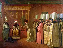 His successful advocacy of French interests in Germany led him to believe his next posting would be as Ambassador to Bavaria.[13] Instead, he was sent to the Ottoman Empire in 1755, first as minister plenipotentiary, then as full ambassador. The reason for Vergennes' original lesser rank was that sending a new ambassador was a time-consuming elaborate ceremony, and there was a sense of urgency because of the death of the previous ambassador.[14] Before he left France, he was inducted into the Secret du Roi.