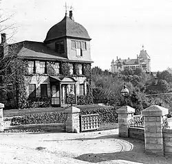 Grey Court (aka Tenney Castle) designed by Carrère and Hastings, prominent New York architects, was the centerpiece of Charles Tenney's 75-acre (300,000 m2) rolling estate Fair View Park. Begun in 1890 and completed two years later, the mansion was modeled after Château d'Yquem, the ancestral seat of Montaigne, and served as the Tenney family's summer home.[8] Ernest W. Bowditch designed the grounds. He had laid out several estates in Newport, Rhode Island, including Marble House, W. K. Vanderbilt's estate; designed Tuxedo Park in New York; and landscaped Colgate University. His designs for Greycourt's surrounds won a prestigious horticultural prize in 1902.[2] The remains are now a Massachusetts state park.