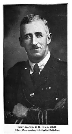 Lieutenant Colonel Charles Hellier Davis Evans, DSO (28 May 1873 – 18 November 1956)[1] served as commanding officer of the New Zealand Cyclist Corps. A long time member of New Zealand's volunteer forces he enlisted in the New Zealand Expeditionary Force at the outbreak of World War I, and served with distinction on the Western Front. He was awarded the Distinguished Service Order (second only to the Victoria Cross for officers), Mentioned in Despatches, and was one of only 14 members of the New Zealand Army to receive the French Legion of Honour decoration during the war.