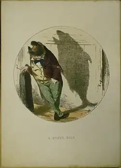 Among Charles Bennett's best known and best loved books were his Shadows series. In Shadow and Substance (1860), Charles Bennett and Robert Barnabas Brough (with whom he had collaborated on the 1854 edition of Punch and Judy) describe a fictional magic lantern which they call the eidolograph. The shadows cast by the eidolograph indicate the true character and personality of the sitter; for example, a fat schoolboy's shadow is portrayed as a snail while Charles Bennett becomes an ass. The collection of shadow illustrations was reprinted several times in colour without the accompanying text and seems to have been something of a best seller. The shadow of a man leaning on a post shows him to be "A Queer Fish" and that of a young woman servant depicts a Black slave.