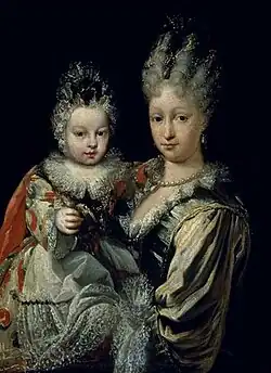 On 20 January 1716, Elisabeth gave birth to the Infante Charles of Spain at the Royal Alcázar of Madrid. He was fourth in line to the Spanish throne, after three elder half-brothers: the Infante Luis, Prince of Asturias (who ruled briefly as Louis I of Spain before dying in 1724); the Infante Felipe (who died in 1719); and Ferdinand (the future Ferdinand VI).[12] Because the Duke Francesco of Parma and his heir were childless, Elisabeth sought the Duchy of Parma and Piacenza for Charles, since he was unlikely to be king of Spain. She also sought for him the Grand Duchy of Tuscany, because Gian Gastone de' Medici, Grand Duke of Tuscany (1671–1737) was also childless.[13] He was a distant cousin of hers, related via her great-grandmother Margherita de' Medici, giving Charles a claim to the title through that lineage.[13]