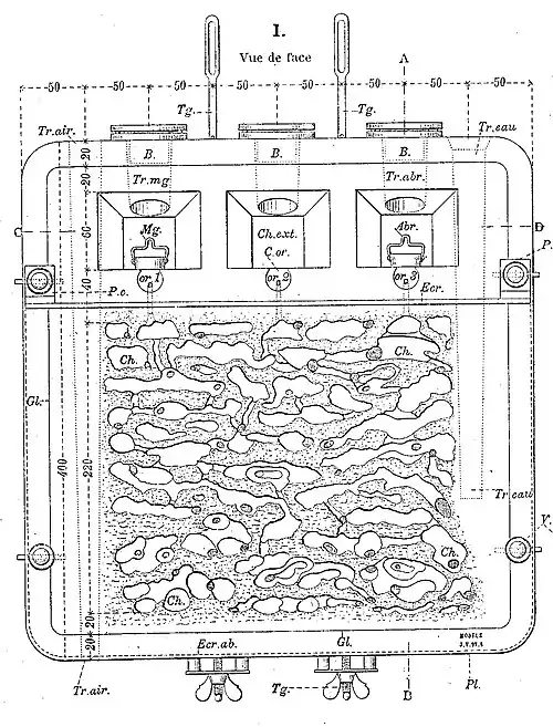 Janet's collection of 50,000 fossils and other specimens was dispersed after his death.[2][4] His studies of the morphology of the heads of ants, wasps and bees, and his micrographs were of remarkable quality.[5] He also worked on plant biology and wrote a series of papers on evolution. He was an inventor and designed much of his own equipment, including the formicarium, in which an ant colony is made visible by being formed between two glass panes.[6] In 1927 he turned his attention to the periodic table and wrote a series of six articles in French that were privately printed and never widely circulated. His only article in English was poorly edited and gave a confused idea of his thinking.[7]