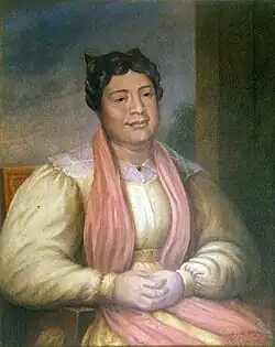 In 1810 the monarch of the independent Island of Kauaʻi, Kaumualii (c. 1778 – May 26, 1824), negotiated a peaceful agreement that allowed Kauaʻi to become a part of Kamehameha I's new Hawaiian Kingdom, while still allowing Kaumualii to remain the islands ruler until his death. The agreement established Kamehameha's son Liholiho as supreme monarch after Kaumauii's death.[16] After Kamehameha I's death, a council was held in July 1821 with Kaumualii and Liholiho, now styled as "Kamehameha II" along with the top chiefs and advisors, including Charles Kanaʻina.[17] Kamehameha II decided to continue his father's arrangements. For this, Kaumualii asked the new monarch to take some Kauaʻi lands for his wives, to appease Liholiho's guardians. While Kamehameha II refused to do so—stating that his father had left no instructions about the land, only that he should be the supreme monarch—he did take Kaumualii's wife Kekaihaʻakūlou as one of his own wives and gave his wife Kekāuluohi to his most trusted advisor, Kanaʻina, as a way to please the chiefs. It is believed the council decision displeased the new Kuhina Nui, Kaʻahumanu. A year later, she would take Kaumualii and later his son Kealiiahonui as her husbands, using the teachings of the missionaries on marriage, to make herself their heirs.[18] Kanaʻina married Miriam Auhea Kekāuluohi that same year on Kauaʻi.[19] Kekāuluohi had been one of several wives of both Kamehameha I and Kamehameha II. She became co-ruler of the Hawaiian Kingdom with Kamehameha III in 1839 as Kuhina Nui (co-regent), styled as Kaahumanu III.[20]