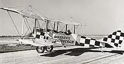 Lindbergh left flying with the onset of winter and returned to his father's home in Minnesota.[24] His return to the air and his first solo flight did not come until half a year later in May 1923 at Souther Field in Americus, Georgia, a former Army flight-training field, where he bought a World War I surplus Curtiss JN-4 "Jenny" biplane for $500. Although Lindbergh had not touched an airplane in more than six months, he had already secretly decided that he was ready to take to the air by himself. After a half-hour of dual time with a pilot who was visiting the field, Lindbergh flew solo for the first time in the Jenny.[25][26] After spending another week or so at the field to "practice" (thereby acquiring five hours of "pilot in command" time), Lindbergh took off from Americus for Montgomery, Alabama, some 140 miles (230 km) to the west, for his first solo cross-country flight.[27] Lindbergh went on to spend much of the remainder of 1923 engaged in almost nonstop barnstorming under the name "Daredevil Lindbergh", this time flying in his "own ship" as the pilot.[28][29] A few weeks after leaving Americus, he made his first night flight near Lake Village, Arkansas.[30]