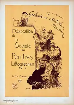 Léandre produced admirable work in lithography, and designed many memorable posters, such as the "Yvette Guilbert." "Les nouveaux mariés," "Joseph Prudhomme," "Les Lutteurs," and "La Femme au chien."[1]