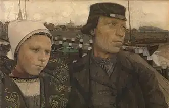 He had a fascination with the life of fishermen, fisher families and sailors and often returned to this subject matter. He painted boats on the Scheldt, the river which flows through Antwerp. He depicted fishermen mending their nets and hauling their boats, mussel fishermen, traditional fisher families of Zeeland in the Netherlands and canal areas.[3][13] He worked regularly in Zeeland, where very clear works were created.[5] In the painting Couple from Zeeland he combined a double portrait of a simple, dignified couple with a view of their home village and boat sails behind them. Although the couple is placed close to the picture plane, they seem aloof and absorbed in their own thoughts. The composition is dominated by the decorative rhythm of the mooring poles leading into the background and the embroidered jacket and headdress of the stoically resolute female figure.[14]